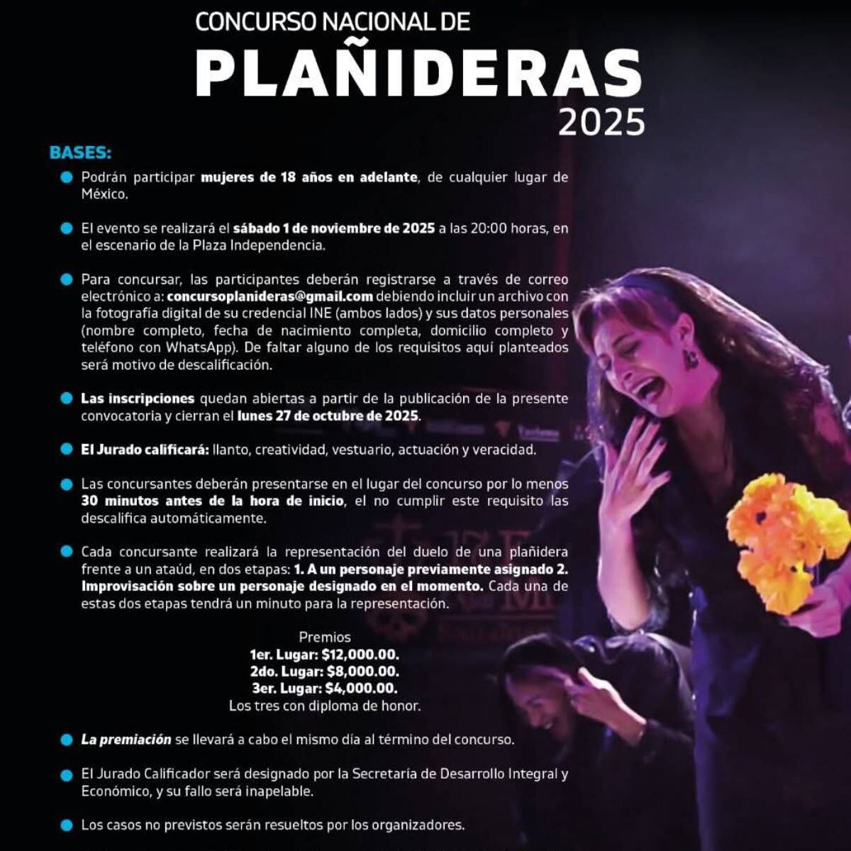 SAN JUAN DEL RÍO, QRO., 22 octubre 2025.- El escenario de la Plaza Independencia volverá a ser sede, este sábado 01 de noviembre a las 20 horas, del “Concurso Nacional de Plañideras 2025”, cuyas inscripciones cierran el lunes 27 de octubre. En este certamen -en el que podrán participar mujeres de 18 años en adelante de cualquier parte del país- el primer lugar ganará 12 mil pesos, el segundo 8 mil y el tercero 4 mil pesos.