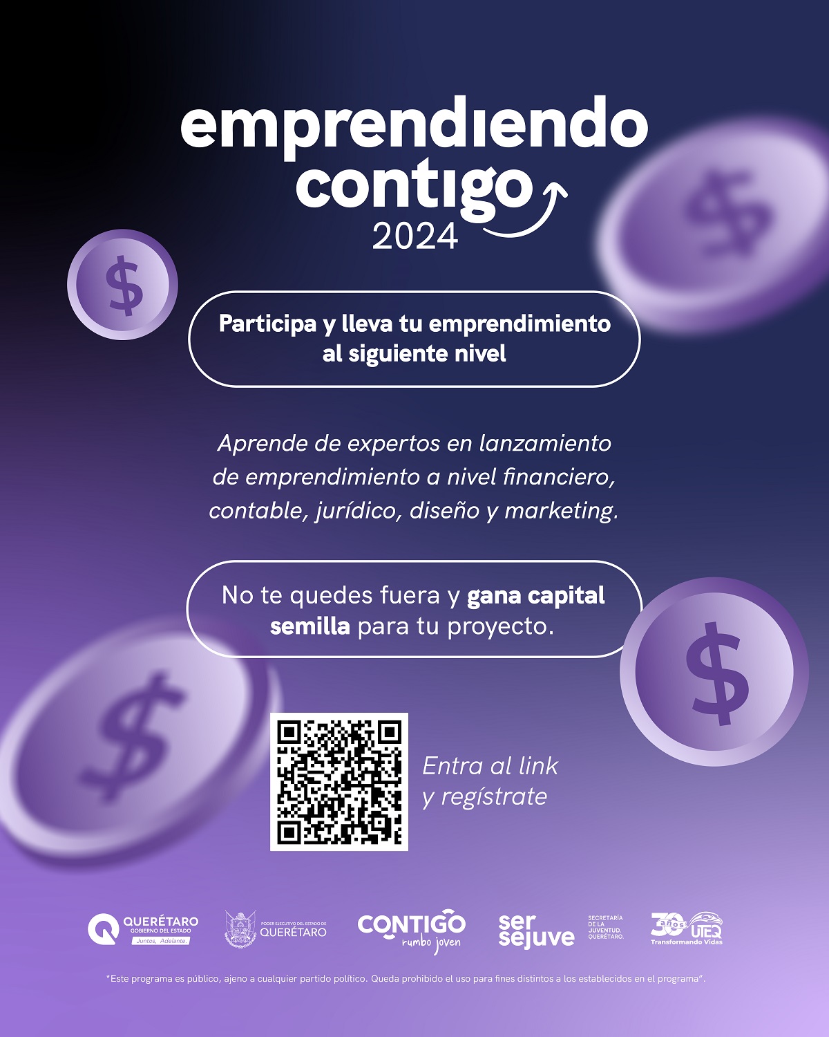 “Emprendiendo Contigo 2024”, en colaboración con la Universidad Tecnológica de Querétaro (UTEQ), busca beneficiar a 50 jóvenes emprendedores del estado. De estos participantes, 30 serán seleccionados para recibir un capital semilla de hasta 40,000 pesos cada uno, destinado a la implementación y crecimiento de sus proyectos de negocio.