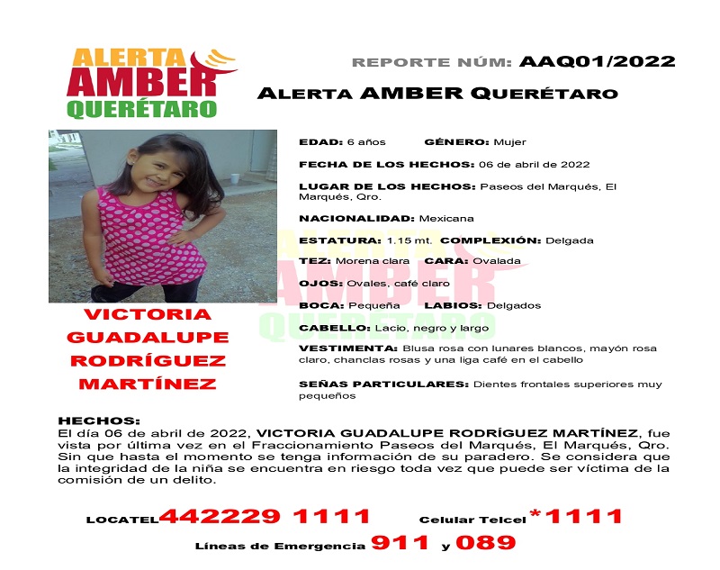 El día 06 de abril de 2022, VICTORIA GUADALUPE RODRÍGUEZ MARTÍNEZ, fue vista por última vez en el Fraccionamiento Paseos del Marqués, El Marqués, Qro. Sin que hasta el momento se tenga información de su paradero. Se considera que la integridad de la niña se encuentra en riesgo toda vez que puede ser víctima de la comisión de un delito.