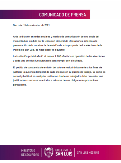 Comunicado del Ministerio de Seguridad