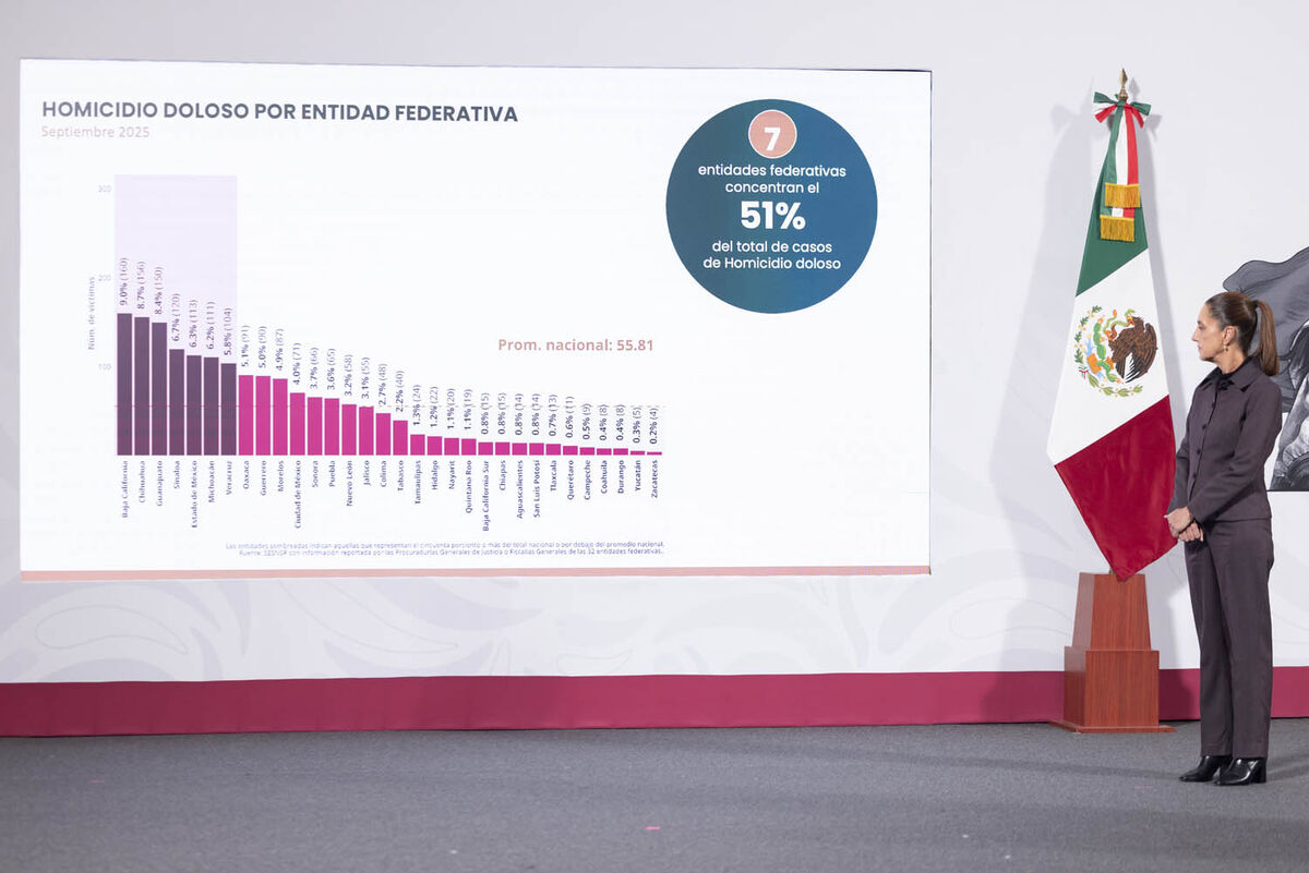 CIUDAD DE MÉXICO., 8 octubre 2025.- La estrategia de seguridad del gobierno federal está comenzando a reflejarse en una contundente baja en los principales indicadores de violencia del país. La presidenta Claudia Sheinbaum Pardo presentó un balance estadístico que muestra que el delito de homicidio doloso ha disminuido un 32% en el último año. El dato más revelador es que septiembre de 2025 se consolidó como el mes con la menor cantidad de homicidios en los últimos 10 años.