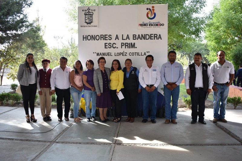 Pedro Escobedo.-La Regidora, Ana Line Piña, en representación del Presidente Municipal de Pedro Escobedo, Amarildo Bárcenas Reséndiz, quien al encabezar la ceremonia de Honores a la Bandera en la Escuela Primaria “Manuel López Cotilla” en la comunidad de Ignacio Pérez, anunció que esta escuela fue beneficiada con la entrega de pintura para el barandal asimismo se dará puntual atención a la petición respecto al bardeado perimetral a este centro educativo.