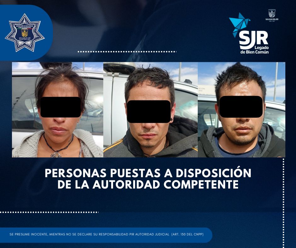 San Juan del Río, Qro. a 18 diciembre 2024.- Elementos de la Secretaría de Seguridad Pública Municipal detuvieron a tres personas señaladas por su probable participación en un robo a casa habitación en la comunidad de La Estancia, tras recibir un reporte ciudadano.