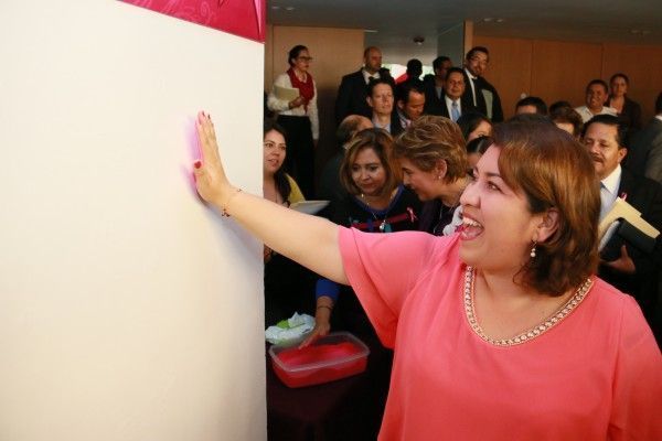 La diputada Ma. Antonieta Puebla Vega presidenta de la Comisión de Transparencia y Rendición de Cuentas de la Legislatura local instaló en el recinto del Poder Legislativo una mampara en la que los 25 diputados de la LVIII Legislatura del estado plasmaron la huellas de sus manos en color rosa con motivo del programa “Súmate a la lucha contra el cáncer de mama”.