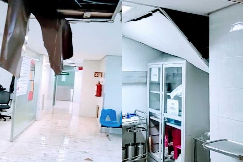 De acuerdo a las versiones la afectación se originó por fallas hidráulicas en la azotea del hospital, penetrando la loza y provocando el lamentable incidente, que si bien no hubo reporte de lesionados, pudo ser más grave.