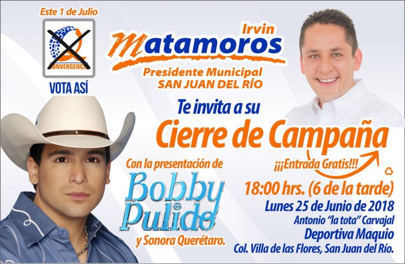 San Juan del Río, Qro; 22 junio 2018.- Con el objetivo de agradecer a la sociedad sanjuanense el apoyo recibido durante la campaña electoral el Partido Convergencia realizará su cierre de actividades proselitistas con un concierto gratuito que ofrecerá el cantante Bobby Pulido.