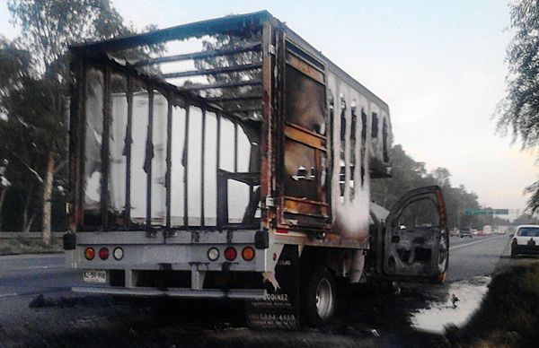 San Juan del Río, Qro., diciembre 17 del 2015.- Una camioneta de tres y media toneladas se incendió en el kilómetro 173 de la autopista México-Querétaro, al parecer producto de un corto circuito, provocando que el fuego la consumiera en minutos sin que se registraran lesionados.