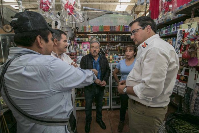 San Juan del Río, Qro. 15 Junio 2018.- Las oportunidades de empleo y emprendedurismo ofrecen desarrollo a San Juan y ayudan a generar entornos más seguros, señaló Memo Vega, candidato a Presidente Municipal de San Juan del Río en su visita al mercado Juárez, la empresa Albek y la pastelería Monsse.