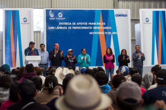 San Juan del río, Qro. 20 noviembre 2016.- Acompañado de su esposa Sra. Male Ruiz y parte de su equipo de trabajo, el Presidente Municipal de San Juan del Río, Memo Vega, entregó 5 mil láminas de fibrocemento, en beneficio de mil familias de 48 comunidades, con el objetivo de que sus hogares sean más cálidos en esta temporada invernal.