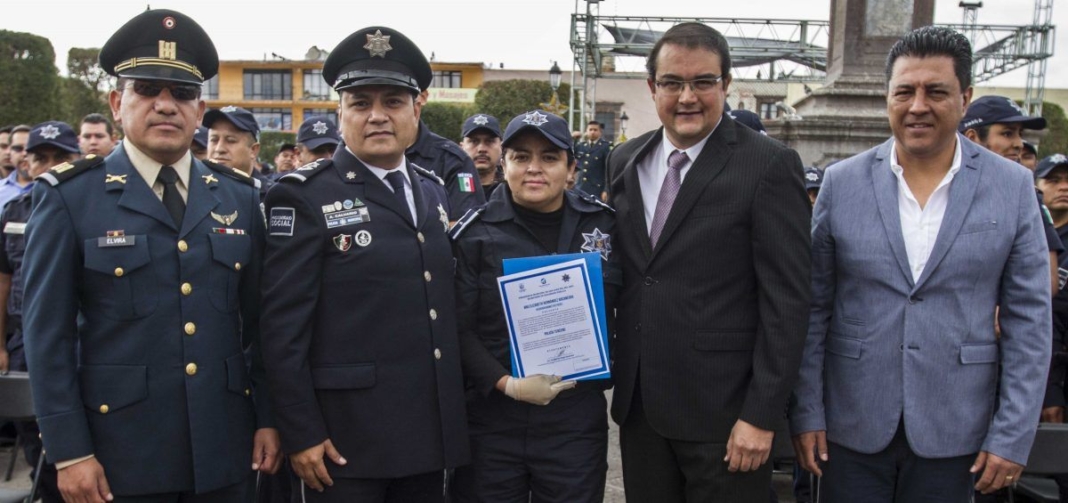 San Juan del Río, Qro., diciembre 20 del 2016.- A celebrarse el Día del Policía, el gobierno municipal encabezado por el alcalde Guillermo Vega Guerrero y funcionarios municipales, quienes reconocieron a 19 oficiales de policía por sus distintos hechos heroicos, así como dos ascensos a los oficiales Ana Elizabeth Hernández Bocanegra quien participó en la contingencia del pasado 26 de enero en el Barrio de la Cruz cuando se dio una explosión por robo de combustible; mientras que al policía Héctor Manuel Torres Zúñiga, al realizar la detención de un maleante, el sujeto accionó un arma de fuego lesionándolo, pero aun así no pudo evitar ser aprehendido.