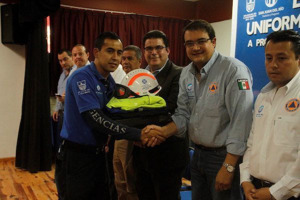 San Juan del Río, Qro. 6 junio 2016.- Teniendo como testigos a los estudiantes del COBAQ 10 de San Pedro Ahucatlán, el Presidente Municipal de San Juan del Río, Guillermo Vega Guerrero, entregó equipamiento a los integrantes de la Unidad Municipal de Protección Civil, que consistió en un detector de atmósferas, kit de heridas, motobombas de succión de agua, equipo de cómputo, pantalones, chamarras, botas, lámparas, cascos y radios de comunicación, lo que representó una inversión de 160 mil pesos.