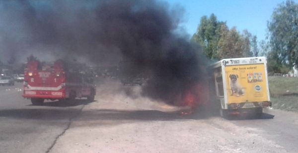 San Juan del Río, Qro., septiembre 23 del 2015.- Un fuerte incendio consumió una camioneta repartidora de alimentos para animales, misma que se presume se debió a un corto circuito ocurrido en la avenida Panamericana a la altura del Cecuco.